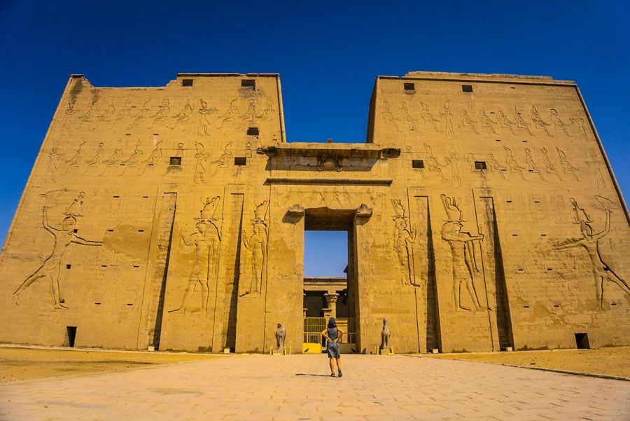 Desayuno en el barco. Visita al templo de Edfu, dedicado al dios halcón, Horus, a su esposa la diosa Athor y la diosa madre, Isis. Aquí apreciamos la batalla del dios Horus contra su tío, el dios Seth, relacionado con la maldad. Regreso al barco, comida y navegación hacia Esna. Tras cruzar por la esclusa de Esna, navegación hacia Luxor. Llegada. Cena y alojamiento a bordo en Luxor.
